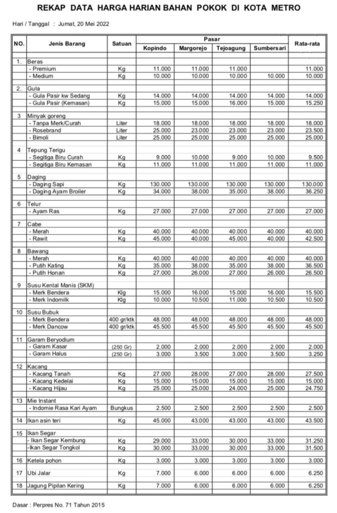 Kegiatan monitoring dilaksanakan secara rutin di 4 (empat) pasar yaitu Pasar Kopindo, Pasar Tejoagung, Pasar Margorejo dan Pasar Sumbersari hal ini dilakukan untuk mendukung stabilisasi harga, pasokan pangan pokok serta infomasi mengenai harga. Dari data yang diperoleh terdapat informasi bahwa ada beberapa bapok yang mengalami kenaikan yaitu daging ayam broiler, cabe rawit, bawang putih honan dan ikan asin teri.