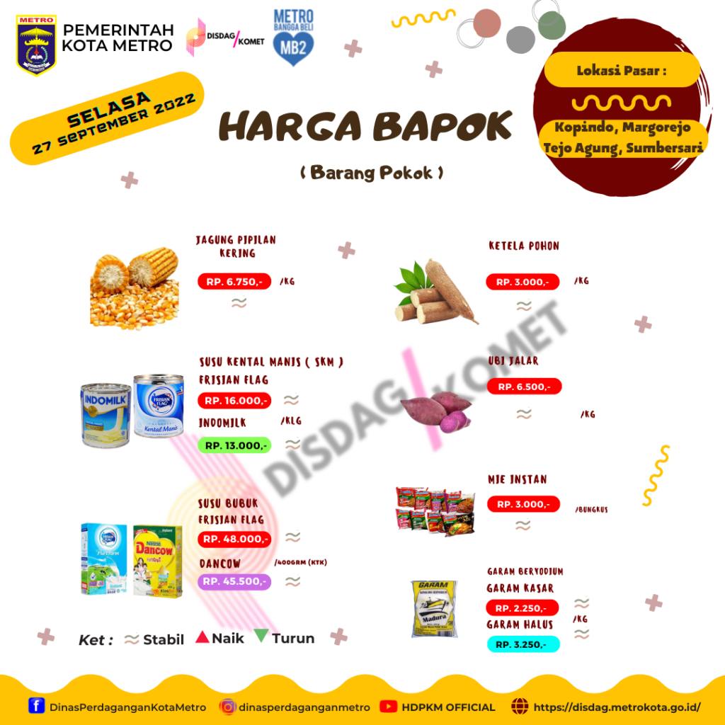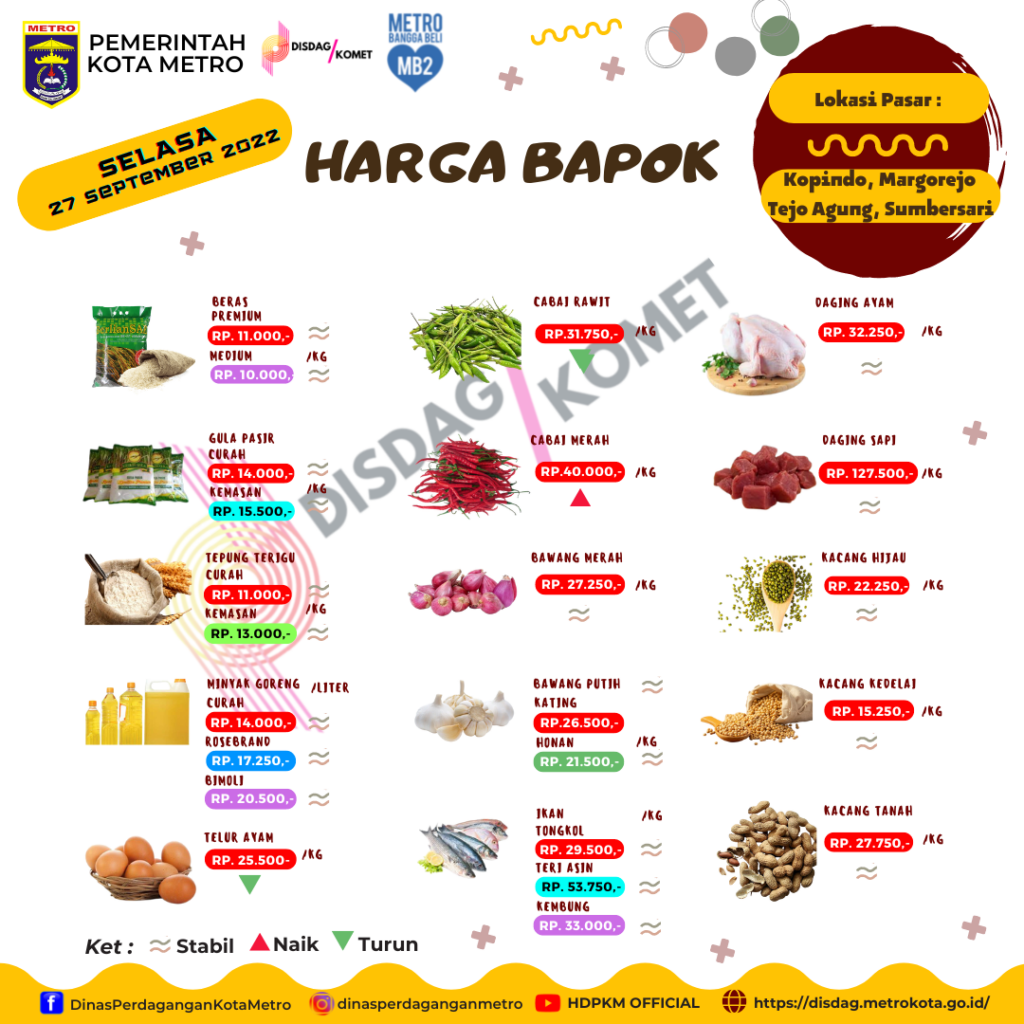 Berikut Update daftar harga kebutuhan barang pokok di pasar Kota Metro pada hari Selasa (27/09/2022).