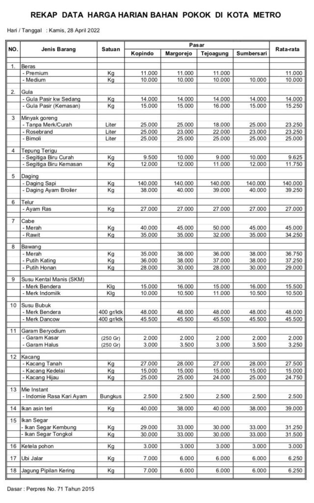 Berikut daftar harga bahan kebutuhan pokok yang dirilis pada Kamis 28 April 2022, yakni Daging Sapi Rp. 140.000 per kilogram, Daging Ayam Rp. 38.000 sampai Rp. 40.000 per kilogram, Cabe Merah Rp. 50.000 per kilogram, Cabe Rawit Rp. 30.000 sampai Rp. 35.000 per kilogram, Bawang Merah Rp.36.000 per kilogram kemudian Bawang Putih Kating Rp. 38.000 per kilogram dan Bawang Putih Honan Rp. 30.000 per kilogram.